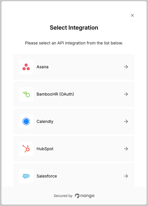Passing a list of integration IDs in allowed_integrations will display a list of integrations that the end user can pick from: