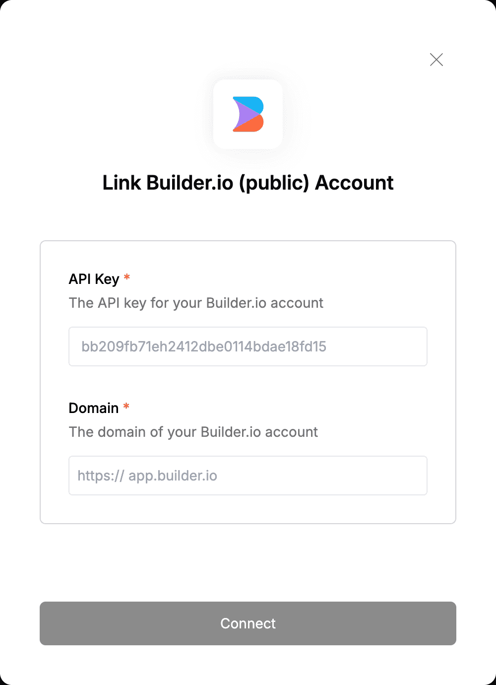 To authenticate with Builder.io (public), you will need:- API Key - A key that grants Nango permission to interact with Builder.io’s (public) APIs resources and services.