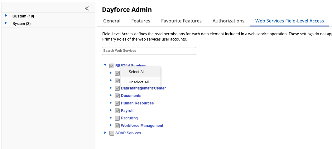 1. Optional: If you need support for writes functionality (i.e. POST /Time-Off), navigate to System Admin > Roles > Features and ensure under HCM Anywhere and Web Services, Patch/Post Employee Time Off is enabled.